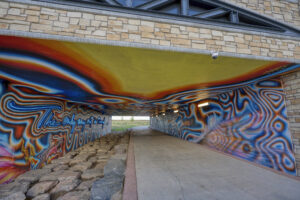 The master-planned community’s acclaimed public art park welcomes a powerful neon and graffiti-art mural and striking 25-foot-tall sculpture installed by three internationally recognized artists.